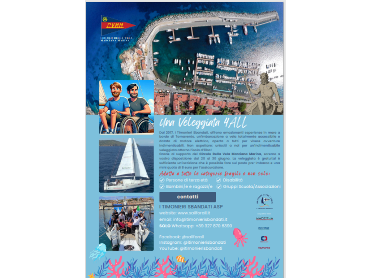 A Marciana Marina Marco e Igor proporranno Una Veleggiata 4All: incontreranno ragazzi e ragazze ma anche adulti che vogliano provare o ri-provare il piacere di andare per mare in condizioni accessibili a tutti. Durante le uscite Marco e Igor parleranno dei loro viaggi ma anche di sfide e ostacoli superati con coraggio e determinazione, di valori ambientali e di ambiente marino, ma anche di argomenti pratici come l’accessibilità dei porti.